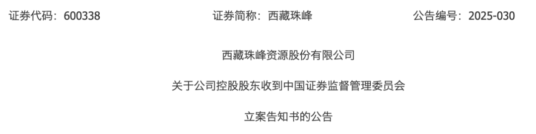7月15日晚间,西藏珠峰(600338)公告称,公司控股股东新疆塔城国际资源有限公司(简称“塔城国际”)于近日收到中国证监会下发的《立案告知书》。因涉嫌信息披露违法违规,中国证监会决定对塔城国际立案。