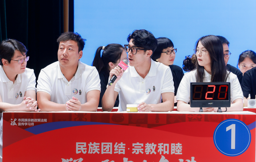 在上海市民族宗教政策法规宣传学习月活动上,旦增(左三)在代表发言。旦增供图