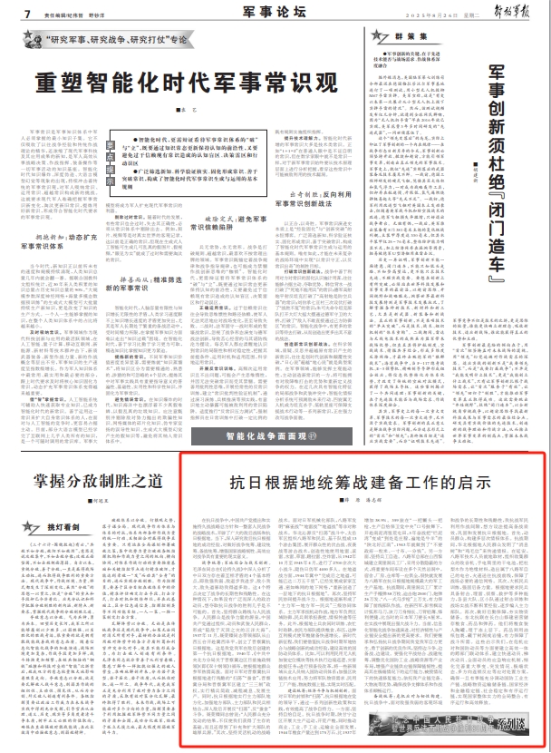 战争统筹:军地结合与战术创新。毛泽东同志在《论持久战》中深入分析了中日双方存在着互相矛盾的4个基本特点,即敌强我弱、敌退步我进步、敌小我大、敌失道寡助我得道多助。这4个特点决定了战争的长期性和残酷性。在这种情况下,如果没有广泛而深入的政治动员,想夺取抗日战争的胜利几乎是不可能的。首先,坚持群众路线与人民战争。人民群众是战争力量的源泉,中国共产党通过组织、动员和武装人民群众,形成“陷敌于灭顶之灾的汪洋大海”。1937年11月,聂荣臻同志带领部队从山西五台开赴冀西阜平,创立了晋察冀抗日根据地。这是我党我军在敌后创建的第一个抗日根据地。1940年,《中共中央北方分局关于晋察冀边区目前施政纲领》(即《双十纲领》)颁布,使根据地群众参军热情高涨。面对日军对晋察冀抗日根据地进行残酷的“扫荡”“蚕食”,晋察冀分局和晋察冀军区建立“三三制”政权,实行精兵简政、减租减息、发展生产。同时,抗日根据地实行主力部队地方化,加强地方部队、主力部队和民兵相结合,深入敌后开展反“扫荡”、反“蚕食”斗争。聂荣臻同志曾说:“人民群众充分发动的结果,不仅使我们获得了生存的基础,而且还得到了补充和扩大部队的雄厚兵源。”其次,坚持灵活机动的战略战术。面对日军机械化部队,八路军发明“麻雀战”“地雷战”“地道战”等非对称战术。华北沁源反“扫荡”战斗中,太岳军区组织八路军和民兵、基干队组成13个游击集团,展开群众性的伏击战、夜袭战等游击战术,创造性地使用地雷、滚雷、水雷、草雷、踏拉雷、空炸雷,从1942年10月至1945年4月,进行了2700余次大小战斗,毙伤日伪军4400多人。在地道战方面,1944年冀中“完成后之地道,可能已达二万五千里”,已经发展成家家互通、密如蛛网的地下网络,“重新创造了一层地下的抗日根据地”。再次,坚持军民协同提升战斗力。根据地逐渐形成了“主力军—地方军—民兵”三级协同体系。主力军承担机动作战,地方军负责区域防御,民兵则承担袭扰、情报传递等任务。此外,根据地士兵农闲时训练、农忙时助耕,农民为部队提供粮食、布匹,这种互利模式使军粮储备快速增长。新时代新征程,我们要借鉴抗日战争时期军地结合与战略创新的成功经验,建设高效的国防动员体系。比如,可以利用民用无人机加装定位模块等技术执行边境巡逻、灾害救援任务;进行预备役改革,将一些新领域从业人员纳入国防动员体系;加强区块链技术应用,努力将军队物资需求、民用工厂产能、物流数据上链,实现实时匹配。