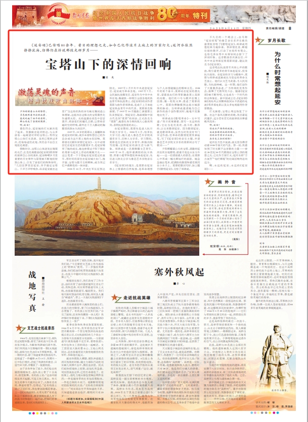 延河在月色中流淌,波光里仿佛浮动着1938年春天的气息。那一刻,我感知到了时光赋予这首歌的力量——曾在20世纪30年代燃烧在宝塔山顶的理想之光,已化作万家灯火,延河水将“万古流芳”“灿烂辉煌”的壮阔回响传送向远方。