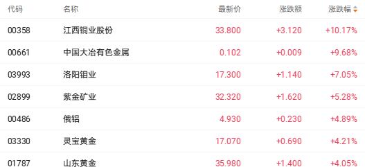 截至收盘,江西铜业股份(00358.HK)涨10.17%、中国大冶有色金属(00661.HK)涨9.68%、洛阳钼业(03993.HK)涨7.05%。