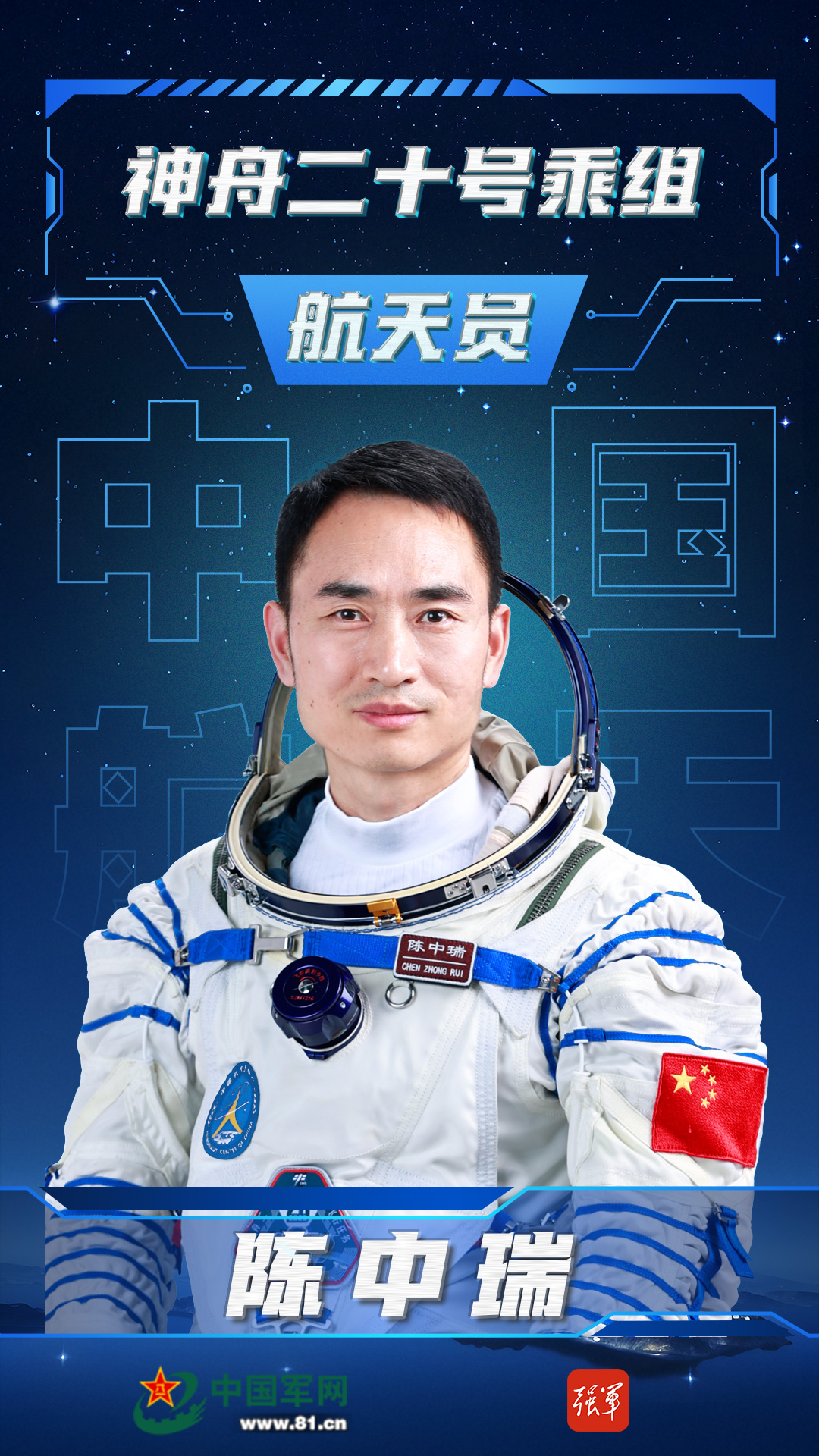 陈中瑞,男,汉族,籍贯河南滑县,学士学位。1984年10月出生,2003年9月入伍,2005年6月加入中国共产党,现为中国人民解放军航天员大队副大队长、四级航天员,空军上校军衔。曾任空军航空兵某旅飞行大队飞行员,被评为空军一级飞行员。2020年9月入选为我国第三批航天员。经全面考评,入选神舟二十号载人飞行任务乘组。