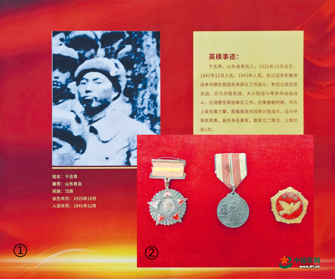 在抗美援朝战争中,于志贵作为侦察兵,曾参加了新兴里战斗。面对武装到牙齿的敌军,他无惧生死、英勇作战,与连队战友在严寒条件下毙伤敌300余人、缴获榴弹炮12门,荣立二等功。