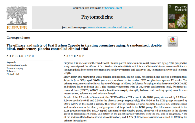 其中,《八子补肾治疗早衰的随机、双盲、安慰剂对照、多中心临床研究》的论文已登上国际权威医学期刊《Phytomedicine》。这项纳入530例30岁到78岁早衰人群的临床循证研究结果显示,服用八子补肾组受试者的端粒酶活性提高了76.7%(基于诺奖获得者伊丽莎白博士的研究发现,端粒酶活性越高,意味着细胞分裂次数越多,生命时间越长),神经、骨骼、肌肉、皮肤、毛发、泌尿、生殖等多系统衰老症状,以及神疲懒言、失眠健忘、记忆力减退等心理衰弱状态都得到了显著改善。
