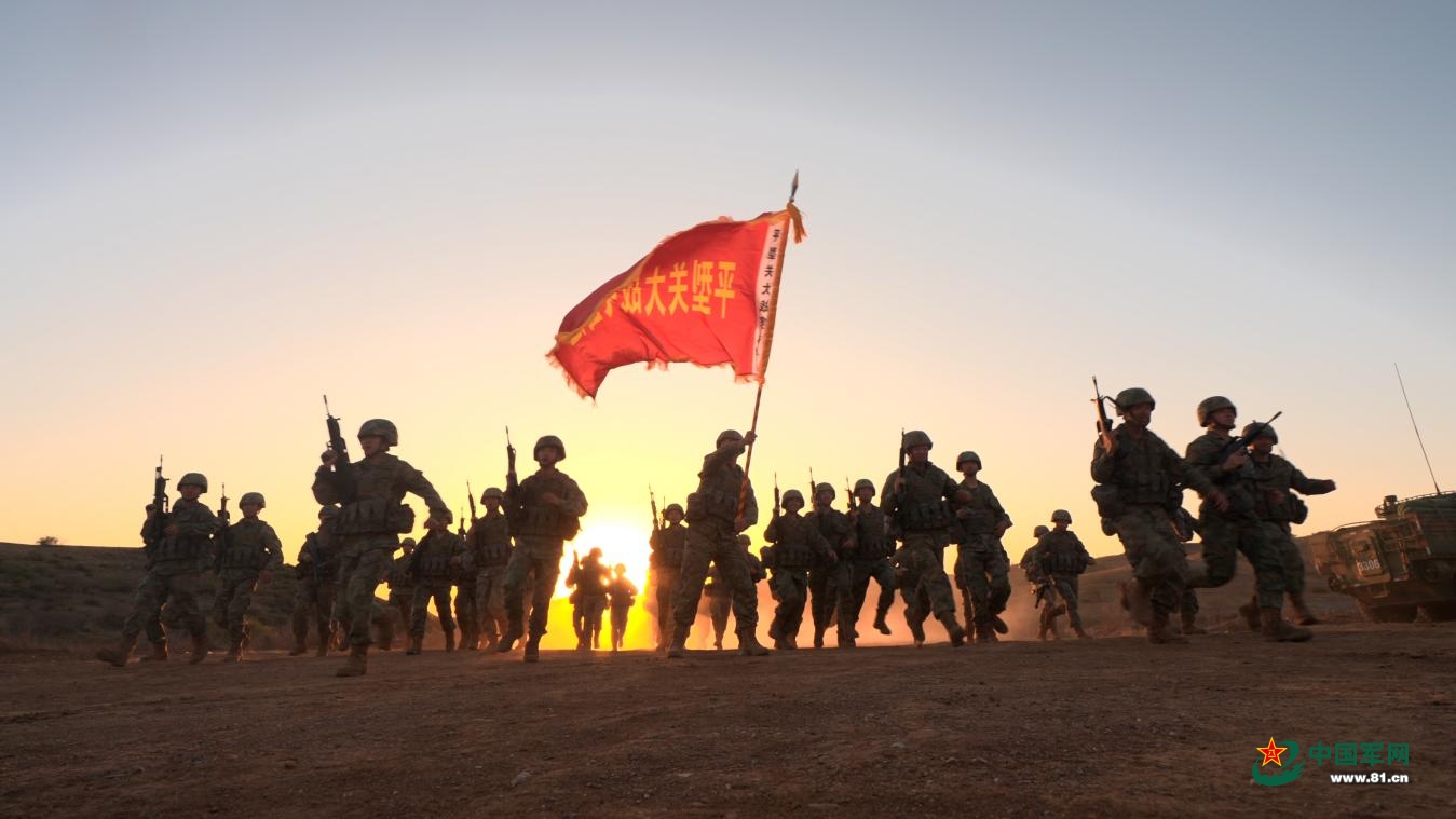 “平型关大战突击连”官兵高擎战旗,向新的胜利发起突击。张佳兴 摄