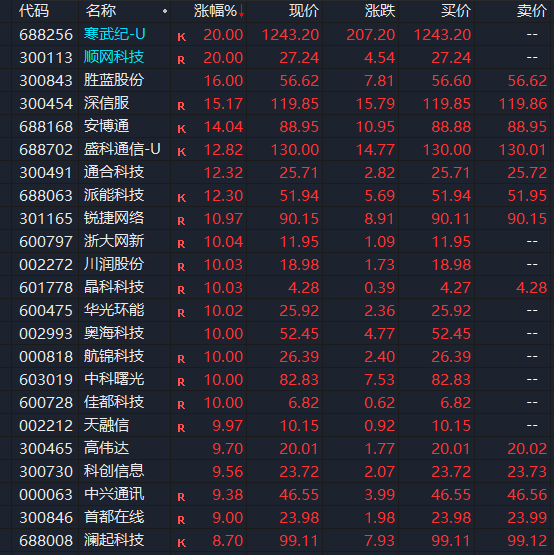 数据中心概念股也集体走强。川润股份、中科曙光、佳都科技、天融信、顺网科技等率先涨停;寒武纪午后也封死涨停板,总市值突破5000亿元,再创历史新高;此外,浙大网新在尾盘直线拉升至涨停,用时不到10分钟。截至收盘,接近20只数据中心概念股涨停或涨超10%。