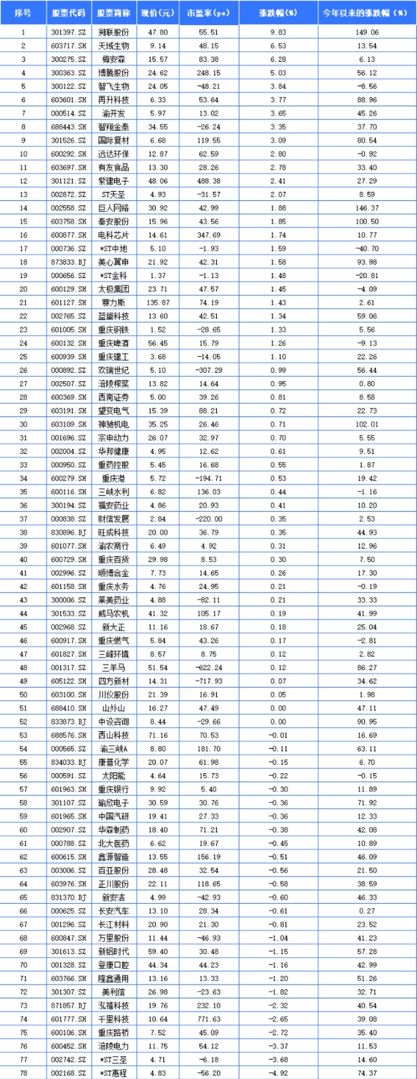 8月25日,78家重庆A股上市公司中有50家上涨。