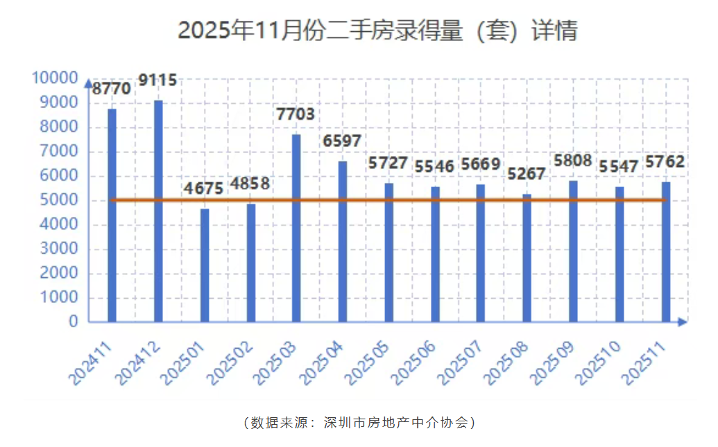 尽管市场整体向好,但内部结构性分化特征愈发明显。深圳市房地产中介协会数据显示,自2025年2月录得低点后,市场成交量已连续9个月维持在5000套以上,并于11月进一步回升至5762套。这表明深圳二手房市场已逐步走出最低谷,交易量进入企稳阶段。成交量的持续稳定,有助于缓和市场情绪,为后续房价预期的稳定提供支撑。