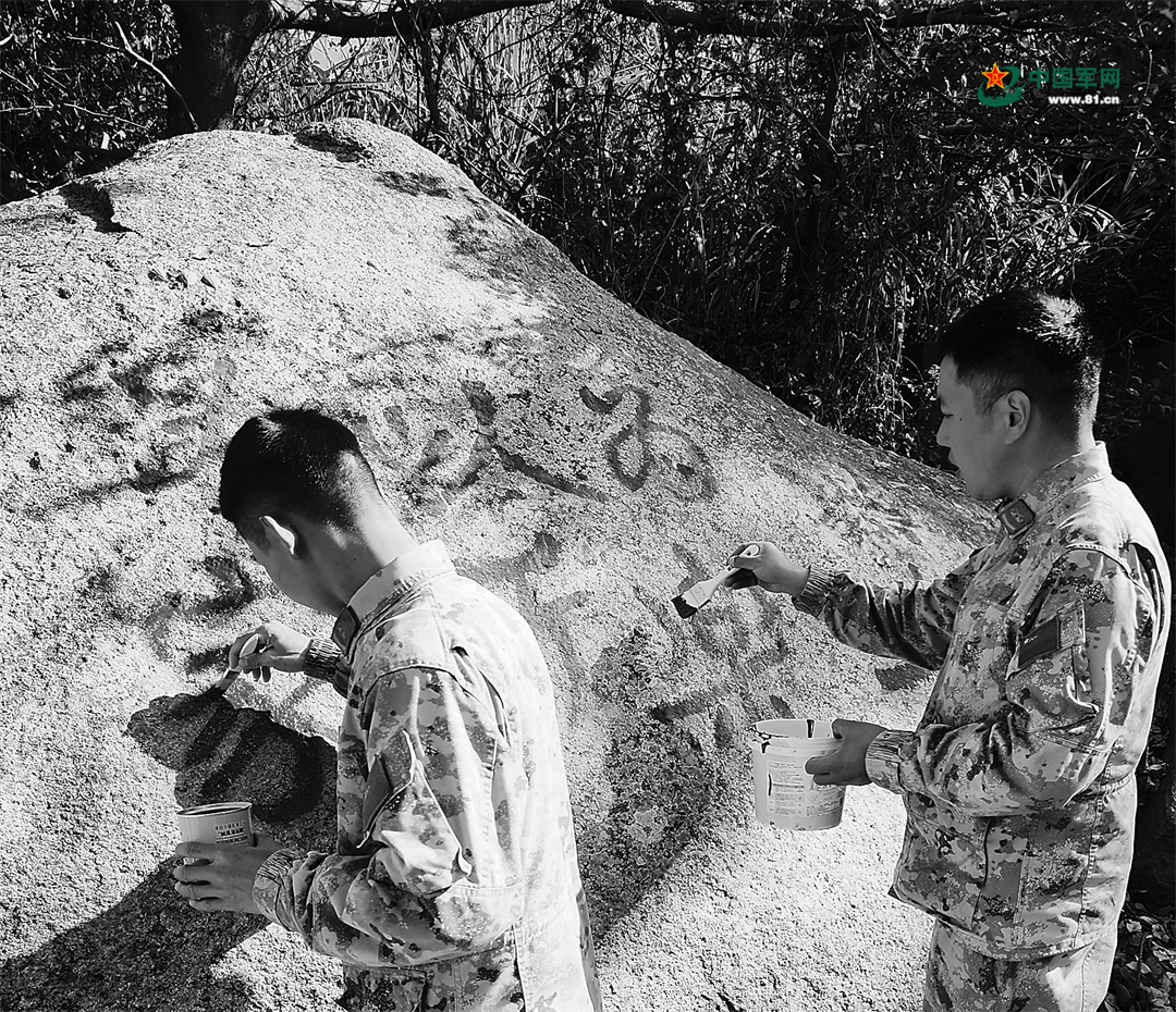 清晨的海风透着咸湿的气息,紫红色的三角梅嫣然绽放,山顶崖壁上,红色的“忠诚”二字嵌在山石的纹路之中。“五一”假期过后的首个工作日,赵能能带着3名小军娃,拎着一桶红油漆,站在山壁前,一笔一划地描红。