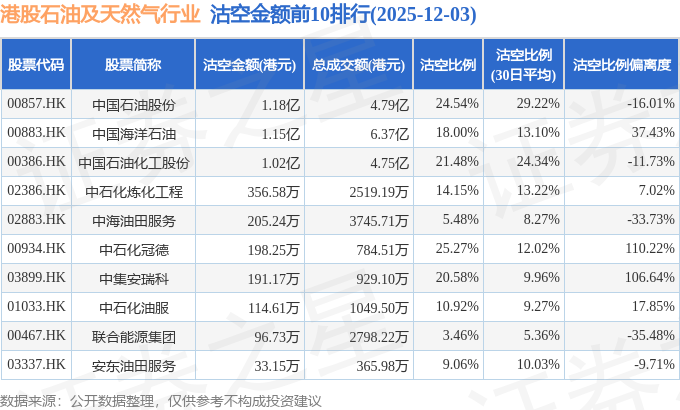 从沽空金额来看,中国石油股份、中国海洋石油、中国石油化工股份沽空金额位居行业前三,分别为1.18亿港元、1.15亿港元、1.02亿港元。 从沽空比例来...